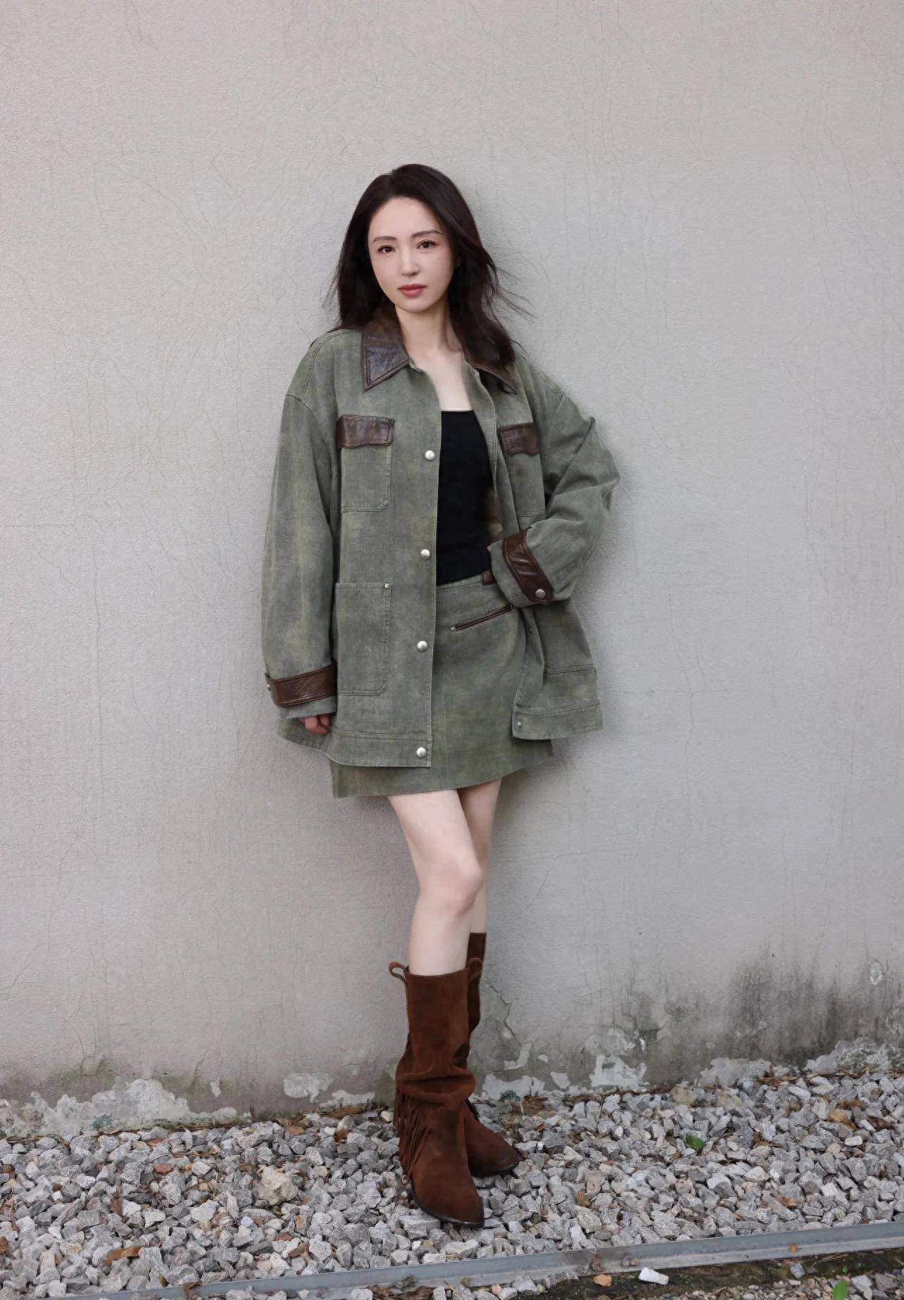 搭配同色系短裙和麂皮棕色长筒靴,露腿效果很惊艳!